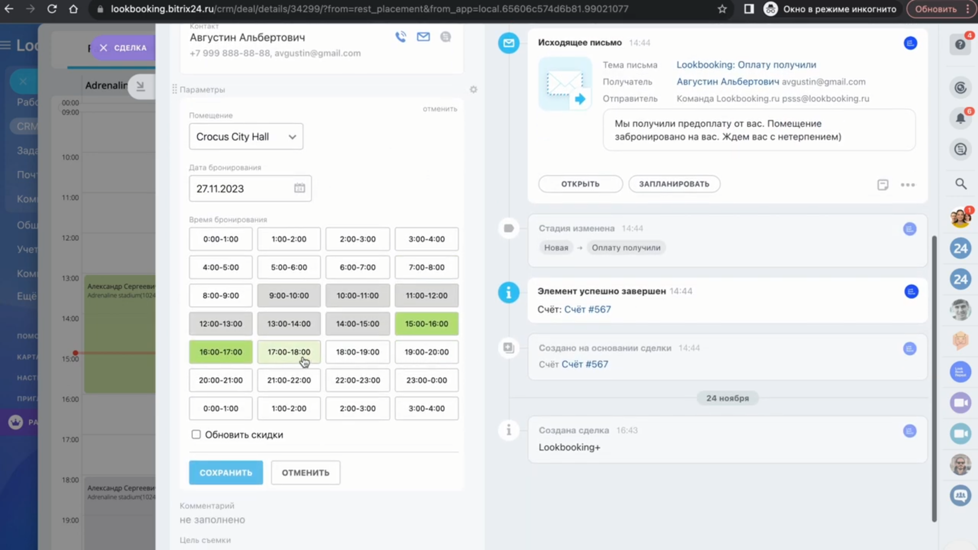 Бронирование интегрировано в карточку сделки
