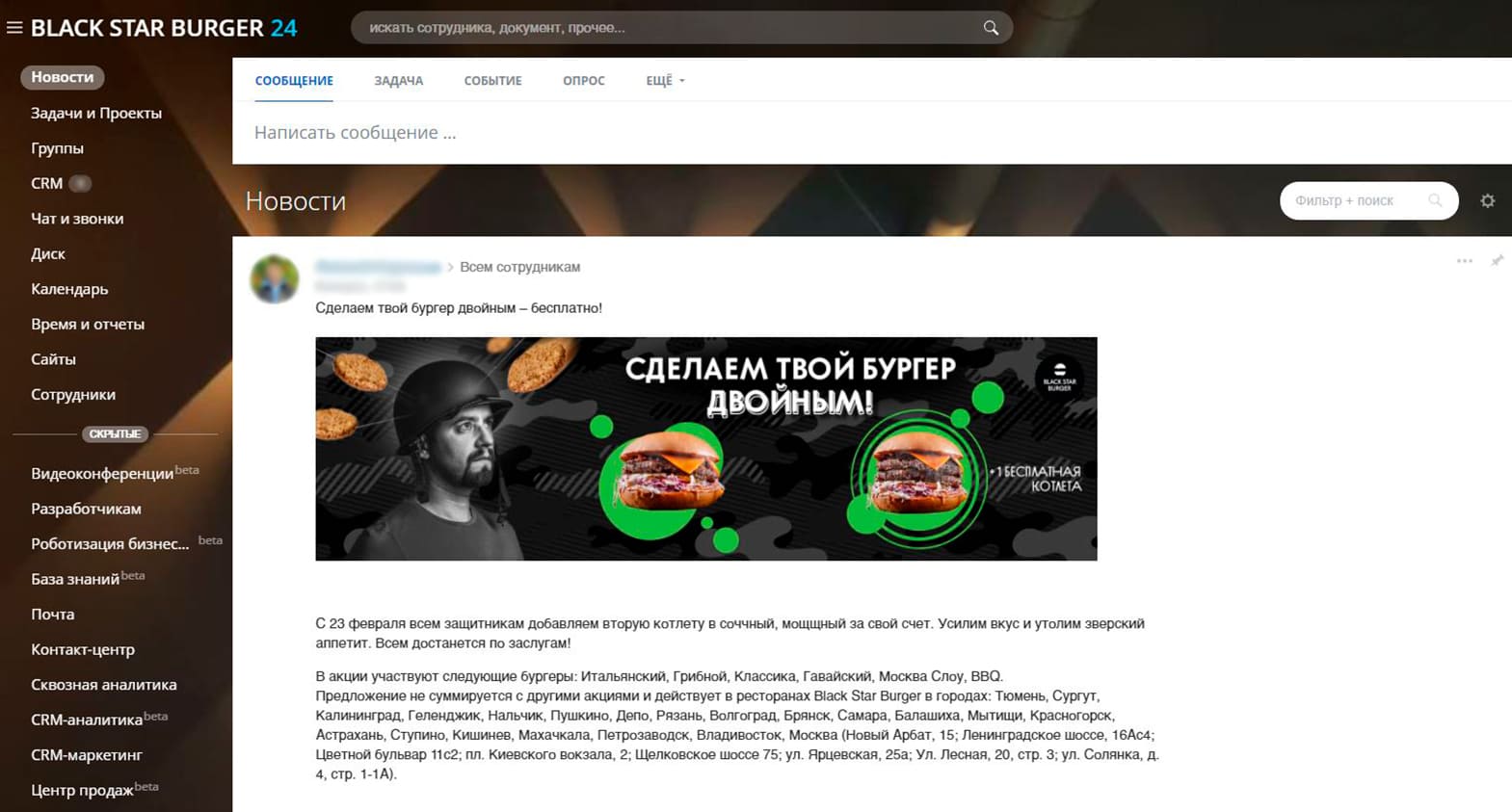Клиент звонит, и еще до поднятия трубки наши администраторы видят карточку с информацией о звонящем, историей предыдущих заказов, адресами доставки и персональными предпочтениями клиента. Битрикс24 позволяет быть более персонализированными и оказывать сервис такого уровня, который ценят наши клиенты. С точки зрения аналитических инструментов Битрикс24 дает возможность анализировать источники привлечения новых клиентов и эффективность рекламных кампаний», — управляющий Black Star Burger в Челябинске.
